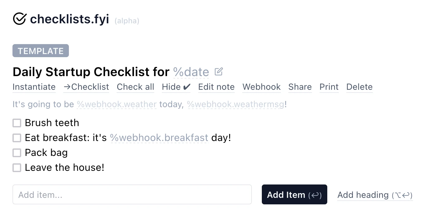 You can use custom tokens when a template is instantiated via webhook. checklists.fyi looks at the (JSON-encoded) POST body of the incoming webhook request and matches them against tokens in the checklist template being instantiated.